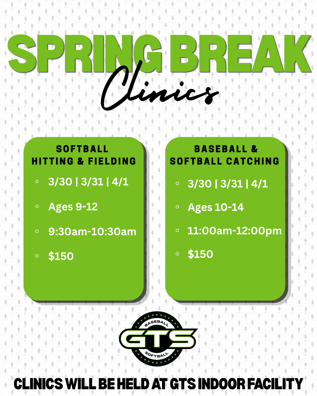 Don’t let the week off slow your momentum. Join us at our indoor facility for our specialized Spring Break Clinics! Whether you’re looking to sharpen your swing, master the field, or dominate behind the plate, we’ve got the reps you need.